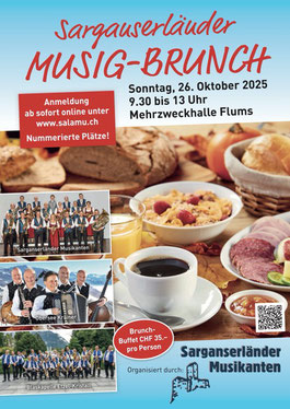Wer sich unseren Sarganserländer Musig-Brunch vom Sonntag, 26. Oktober nicht entgehen lassen will, sollte sich jetzt noch ganz schnell anmelden - das wird SUPER, wir freuen uns auf euch!